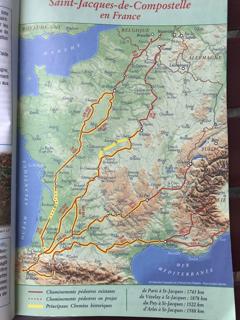 So Le Chemin de Compostelle and El Camino were paths, remember that France has 4 Le Chemins de Compostelle and there are others in different countries including several in Spain, that eventually ended at the Cathedral de Santiago de Compostela (https://catedraldesantiago.es/en/cathedral/). The cathredal was built in the 11th Century after the bones of St. James were miraculously discovered buried in a field. St. James was an apostle who lived in the time of Christ, so, if you buy the story, were 1000 years old when there were found. A legend that developed that, by the short version, that St. James came to Spain in a boat made of stone. Anyway, the local bishop declared the found human bones to be those of St. James and, perhaps seeing a future here, built a cathedral to show off the bones.
